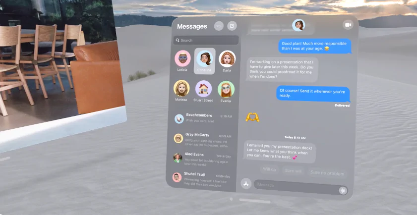 FaceTime calls made with Apple Vision Pro take advantage of the space around the user. Everyone on the call is displayed in life-size tiles, and Spatial Audio makes it appear as though callers are speaking directly from their positions. During a FaceTime chat, users wearing Vision Pro are represented as a Persona, a digital image of themselves made using Apple’s most cutting-edge machine learning methods. Personas reflect face and hand movements in real-time. Together, users can watch a movie, look through images, or work on a presentation.
